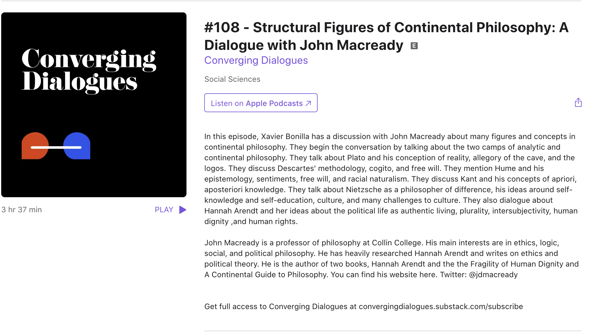 In this interview, Xavier Bonilla and I discuss many figures and concepts in continental philosophy. We begin by discussing the distinction between analytic and continental philosophy. We discuss Plato and his conception of reality, the allegory of the cave, and logos; René Descartes’ methodology, cogito, and free will; David Hume’s epistemology, sentiments, free will, and racial naturalism; Immanuel Kant’s concepts of a priori and a posteriori knowledge; Friedrich Nietzsche as a philosopher of difference, his ideas around self-knowledge and self-education, culture, and many challenges to culture; and Hannah Arendt’s ideas about the political life as authentic living, plurality, intersubjectivity, human dignity, and human rights.
